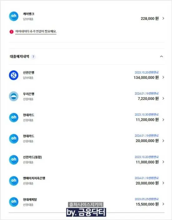 토스와 카카오페이를 통해 총 6곳에서 조건 확인되었는데요. 그중 한 은행에서 5천만 원 / 7.19% / 120개월 상환 조건으로 승인되었고 추가적으로 2금융권에서 2,840만 원 / 12.83% / 60개월 조건 승인 받아 컨설팅 마무리하였습니다.
