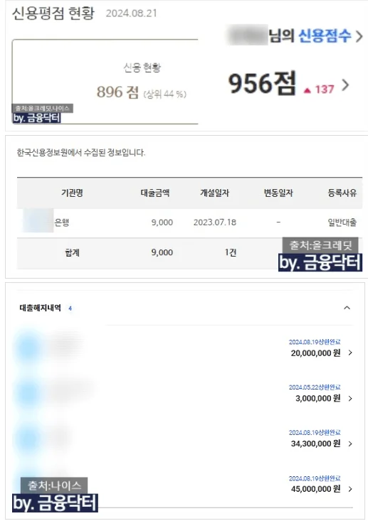 점수가 모두 반영되면서 나이스 956점 올크레딧 896점이 확인되었습니다. 점수 자체는 매우 우수했으나 공제회 구간상 올크레딧 점수가 조금 더 상향될 경우 추가 한도 발생 가능성이 있었기에 비금융 정보 등록과 설문조사 등을 안내했고 이후 올크레딧 점수는 910점까지 상향되었습니다.