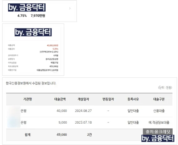 🏦 이후 가능성 있는 은행 몇 곳을 확인한 결과 여러 은행에서 한도가 발생했습니다. 가장 낮은 금리는 7970만원 4.75퍼센트 조건이었으나 만기 일시 또는 마이너스 통장만 가능했습니다.