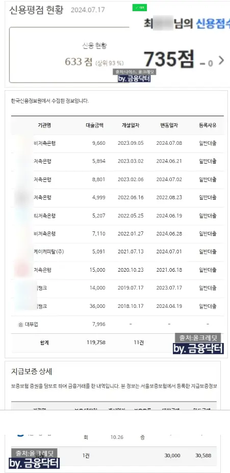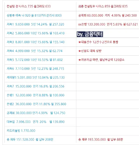 이후 신용점수는 급락했고, 공제회나 은행권 저금리 상품은 모두 거절되는 상태였습니다. 다음 달부터 연체가 예상되는 상황에서 채무통합대환대출을 검색하던 중 금융닥터 블로그의 실제 사례를 보고 문의를 주셨습니다.