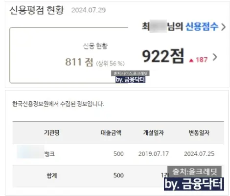 상환 후 나이스 922점 / 올크레딧 811점 확인