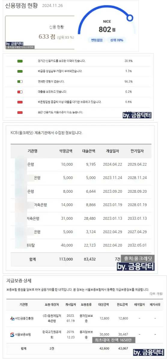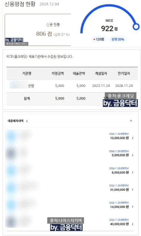 • 신용카드 한도 대비 사용금액이 높아 올크레딧 점수가 크게 하락된 상황이었습니다.