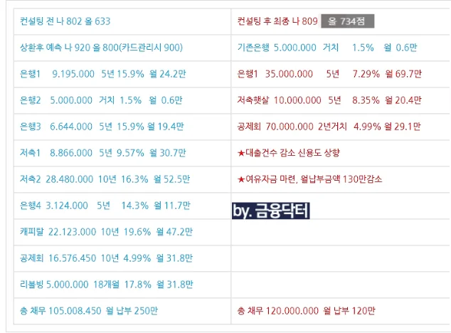 연 소득 2700만원 수준에서 1억1000만원 규모의 채무를 저금리로 정리하는 것은 교직원이라는 직군 특성 없이는 사실상 불가능한 구조입니다. 교직원처럼 직군 특화 금융 혜택이 존재하는 경우라면 부채가 과다하더라도 컨설팅을 통해 저금리 대환이 가능한 사례들이 분명히 존재합니다.