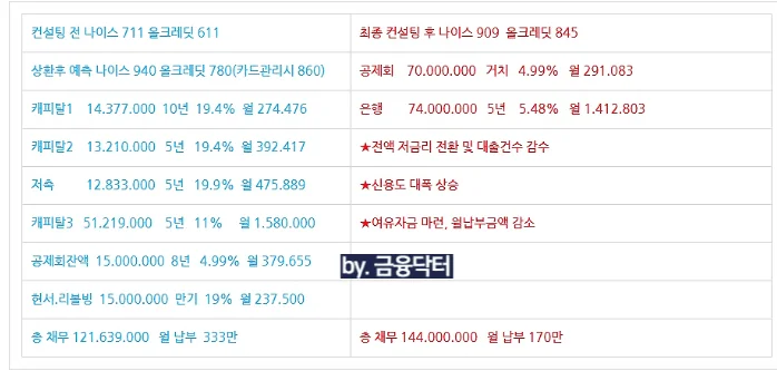 이후 복직을 하여 은행권 대환을 알아보았지만 이미 2금융권 대출과 카드 돌려막기로 신용점수가 크게 하락된 상태였고 은행권에서는 모두 불가 통보를 받으셨다고 합니다. 여기에 친정 쪽으로 급하게 자금이 필요해 다시 2금융권을 이용할 수밖에 없는 상황이 이어졌다고 합니다.