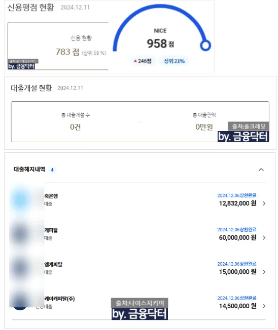 카드 잔액을 제외한 대출 및 신용도가 모두 반영되며 나이스 958점 올크레딧 783점이 확인되었습니다.