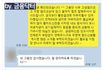 한도가 더 높고 상환 기간을 길게 가져갈 수 있는 은행도 있었으나 금리가 7퍼센트대로 높았고 고객분께서는 월 납입 부담에 문제가 없는 선에서 최대한 저금리를 원하셨기에 해당 상품으로 전액 신청하셨고 정상 승인으로 모든 통대환 컨설팅은 마무리되었습니다.