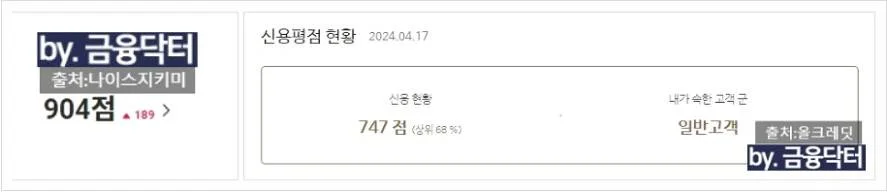 4월 12일 미팅 후 사용 중인 은행 1건인 5100만원은 유지하고 6900만원을 상환처리했습니다. 4월 17일 신용점수는 많이 올랐지만 카드 잔액이 많아 올크레딧 점수가 낮게 나왔습니다.