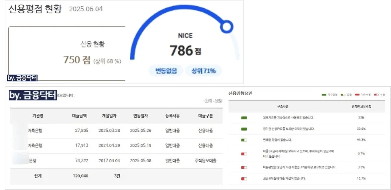 최근 신용회복 중도 완제 이력이 존재했고 나이스 점수가 다소 낮게 형성되어 있었습니다.