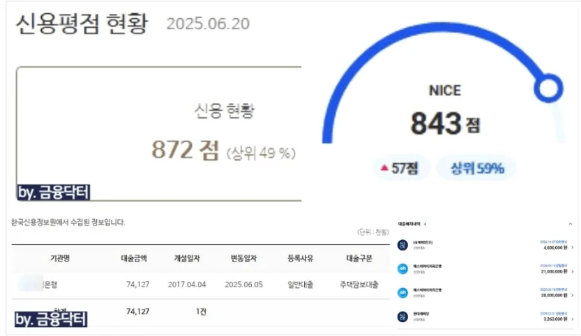 6월 20일 점수가 반영되며 나이스 843점 올크레딧 872점을 확인했습니다. 이번 케이스는 전액 상환이 아닌 부분 상환 구조였기 때문에 적합한 은행을 선별해 안내해 드렸습니다. 해당 은행은 원칙적으로 비대면 진행이 가능했지만 건강보험료 편차가 큰 경우 비대면 승인이 어려운 구조라 콜센터를 통해 한도를 확인한 뒤 지점 방문 진행을 선택했습니다.
