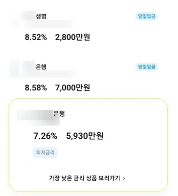 대출 금리 (최저 금리) | 15.57%~19.9% | 7.26%~8.58% |