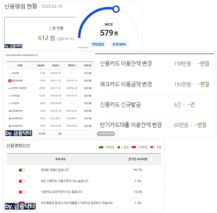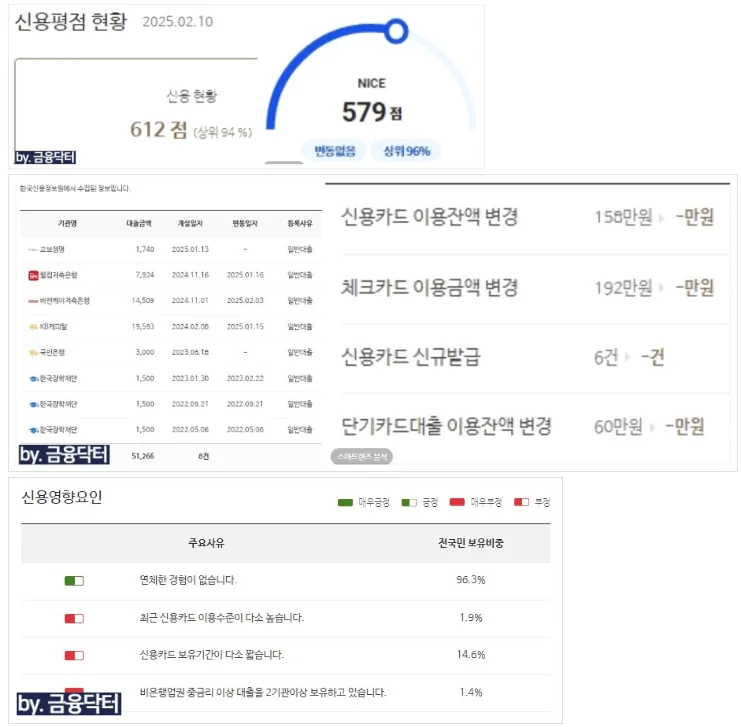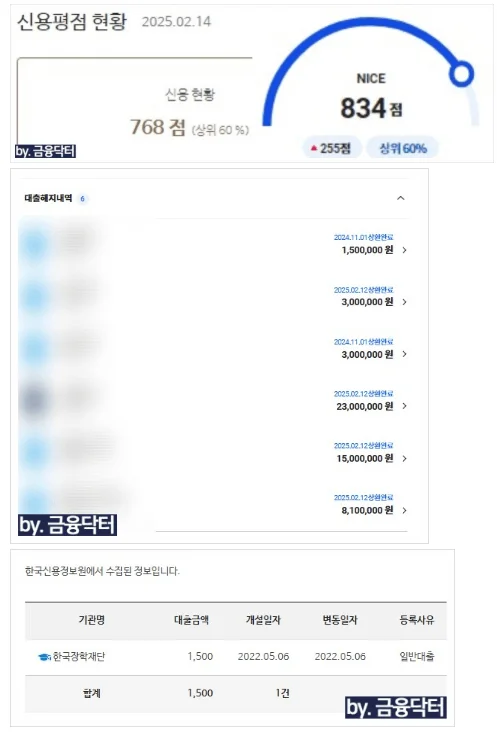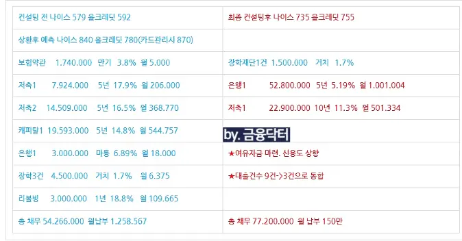 2월 12일 미팅을 진행한 후 장학재단 대출 1건을 제외한 기존 대출과 카드 잔액 그리고 여유자금을 포함해 총 5900만 원을 상환 처리했습니다. 장학재단 대출은 금리는 낮았지만 여러 건으로 나뉘어 있어 미상환 시 신용도 예측 점수가 지나치게 낮게 산정되어 불가피하게 일부 정리를 진행했습니다.