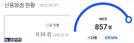 5월 7일 정기 변동 이후 나이스 857점 올크레딧 834점까지 점수가 상향되었고 재확인 결과 한도 제한이 해제되어 5280만 원 금리 5.19% 5년 상환 조건으로 은행권 대출이 정상 실행되었습니다.