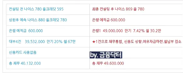 월 납부금액은 기존 대비 절반 이상 감소했고 최종 컨설팅 이후 신용점수도 나이스 869점 올크레딧 780점을 유지하고 있는 상태입니다.