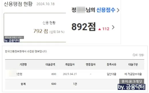 점수가 모두 반영되며 나이스 892점 올크레딧 792점이 확인되었습니다. 예상보다 점수가 높게 형성된 상황이었습니다.