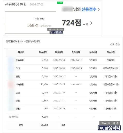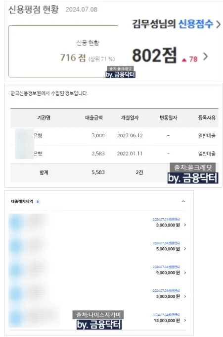 7월 4일 계약서 작성 및 공증 절차를 완료한 뒤 초저금리 유스상품 두 건을 제외하고 3300만원 상환처리가 진행되었습니다. 이후 7월 8일 신용점수가 반영되어 나이스 802점 올크레딧 716점으로 확인되었는데요. 아직 두 건의 대출이 남아 점수가 완전 회복되진 않았지만 이후 카드 잔액 변동일에 맞춰 추가 상승을 기대하며 관리하기로 했습니다.