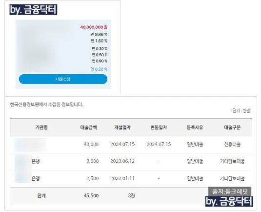 1번 은행에서는 4000만원 금리 8.26%, 3500만원 금리 11.48% 조건이 확인되었고 다른 은행에서는 2500만원 금리 5.612% 조건이 확인되었습니다. 하지만 두번째로 나온 곳은 최근 상환 이력이 일정 건수 이상일 경우 거절 처리되는 규정이 있어 당장 진행이 어려웠습니다. 따라서 1번 은행으로 신청을 권유드렸고 정상 승인되어 모든 컨설팅이 마무리되었습니다.