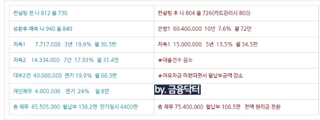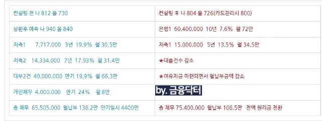 미팅 후 개인 채무 포함 총 6600만원 전액 상환을 진행했습니다. 빠른 진행을 원하셨기에 신용도에 영향이 적은 저축은행 채무 1건은 소액으로 남겨두었습니다.