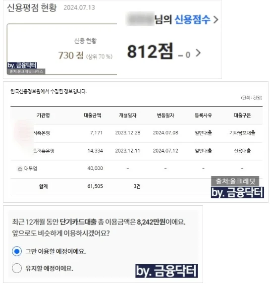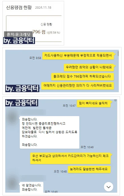 올크레딧 점수가 갑자기 796점까지 급락했습니다. 확인 결과 카드 한도를 전액 사용한 이력이 확인되었고 카드 현금화 정황까지 발견되었습니다.