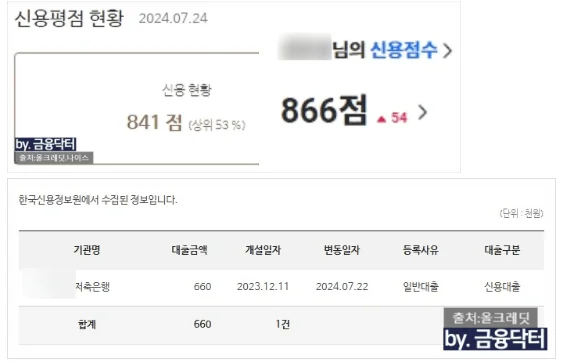 점수 반영 이후 나이스 866점 올크레딧 841점 확인