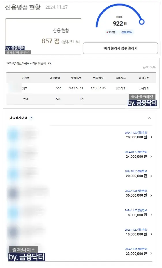 대출 및 점수가 모두 반영되며 나이스 922점 올크레딧 857점이 확인되었습니다.