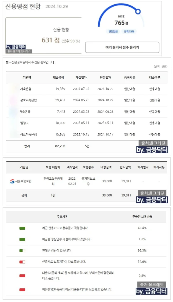 직장인 통대환 컨설팅 기간은 약 2개월 정도 소요되었으며 최종 신용도는 나이스 835점 올크레딧 837점을 유지하고 있습니다. 여유자금까지 확보했음에도 평균 금리는 5퍼센트대로 낮아졌고 월 납부금액은 오히려 줄어든 구조로 마무리되었습니다.