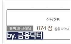 카드 잔액이 줄어들며 올크레딧 점수가 874점까지 상향되었습니다.