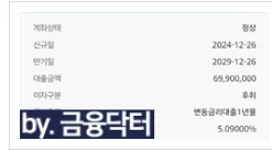 해당 은행에서 6990만원 금리 5.09퍼센트 조건이 확인되었습니다. 상환 기간은 최장 5년으로 다소 짧았지만 금리 측면에서 유리한 조건이었고 월 납입 부담도 크지 않아 신청을 진행해 정상 승인되었습니다.