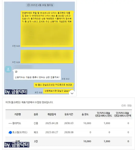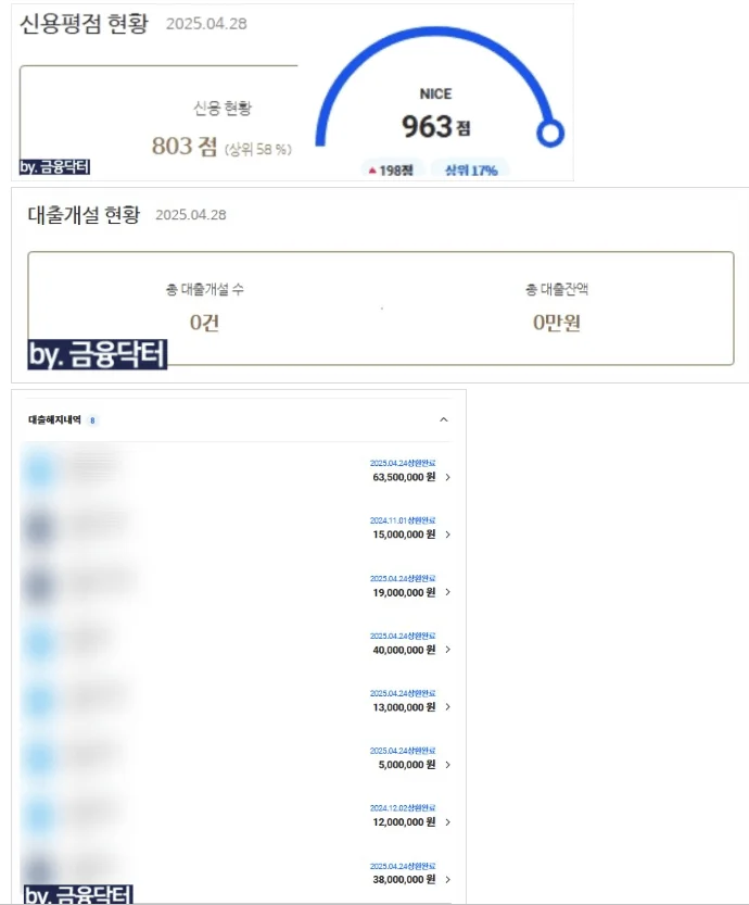4월 28일 대출 상환 내역과 신용도 반영이 완료되면서 나이스 963점, 올크레딧 803점을 확인할 수 있었습니다. 올크레딧 점수가 다소 낮게 형성되어 신용카드 개설과 관리 방향에 대해 추가 안내를 드렸습니다.